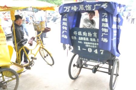 Ich hatte schwarzes Garn, eine Porzellanschüssel mit blauen Fischmotiven für Obst, zwei viereckige Teller, 10 Kleiderbügel, getrocknete Früchte und in der Schale karamellisierte Mandeln gekauft, komme aus diesem Gewirr von Gängen und es regnet mal wieder. Viele Rikschas warten auf Kunden und gleich vorne, nickt mir eine Frau ermunternd zu und klopft auffordernd auf den Holzsitz. Sie hat eine rote, kurze Lederjacke , enge mit Glitzersteinen verzierte schwarze Jeans an, kurze, schwarze Haare und ist nicht viel jünger als ich. Also ca. Anfang vierzig.