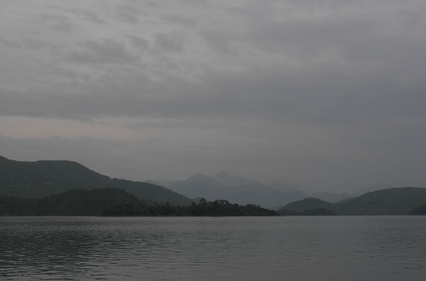 Drinnen sitzen sechs Männer mit Schwimmwesten. Sie betreuen die Uferlandschaft und die Insel. Vielleicht angeln sie auch, was für die Bevölkerung nicht mehr erlaubt ist. Auch nicht baden. Und das neu gebaute Hotel auf der Insel durfte nicht aufmachen. Jetzt haben es die Landschaftspfleger dort schön. Die Insel ist mit Pfirsichbäumen dicht bepflanzt, die gerade Früchte tragen. Rosen, Bananenstauden. Stufen zur Villa mit Holzveranda. Sehr romantisch und ganz verlassen. Mücken haben die Insel fest in ihrem Besitz. Wir fahren wieder ab.