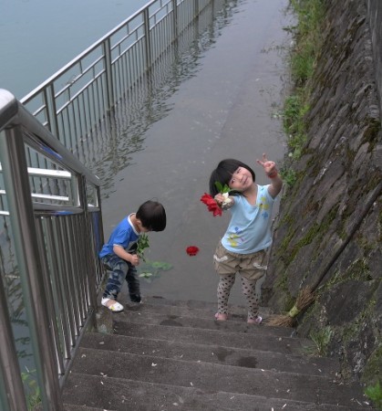 Die Ausflügler aus der Stadt haben Spaß und lassen auftischen was an Bestem nur denkbar ist. Ich komme mir vor wie an der Seine 1880. Wir kaufen seine Pfirsiche und er bricht sofort auf. Es dämmert schon. Ab und zu fährt ein Motorrad oder Auto viel zu schnell durch die schmale Straße zwischen Wasser und Häusern. Wegen der Kinder wollen wir lieber drinnen essen, als wir draußen oder drinnen wählen sollen. Später als es dunkel ist, spielen die Kinder draußen auf der Straße.