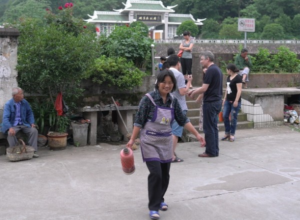 Jetzt fahren wir wieder zu der Talsperre wie tags zuvor. Das Maodorf hatten wir schon abgewendet und zugegeben, dass wir gestern schon dort waren. Der Eintritt kostet dort immerhin 100 RNB. Wir sind 8 Erwachsene und zwei Kinder. Und trotz einiger Telefonate mit Entscheidungsträgern war am Ticketpreis nicht zu rütteln