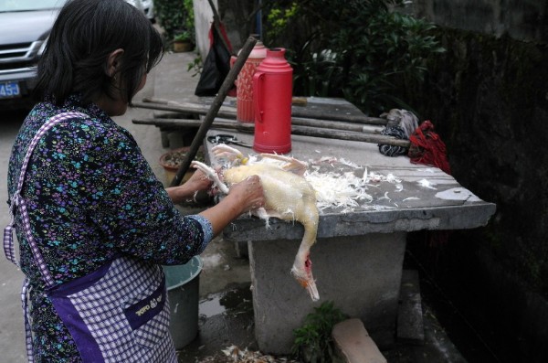Und da läuft auch schon die Gans, die für uns zubereitet werden soll am Wasser entlang. Gerupft wird sie an dem Gewässer, gebadet und ausgenommen in einer sehr großen Metallschüssel.