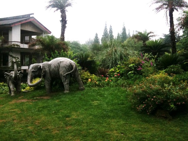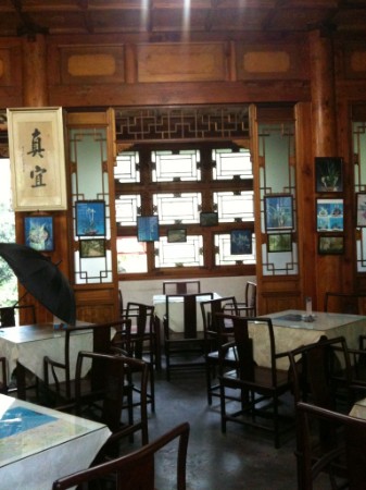 Porzellan, Steinarbeiten, verblichene Fotovergrößerungen von Männern an Schreibtischen, die Geschichte des botanischen Gartens. In die Hausanlage integriert ein kleiner Fluss und Wasserfall. In einem Raum sitzen echte Leute und essen. Aufsichtsleute. Es gibt mehrere Tische, wie in einem europäischen Restaurant. Wir gehen weiter zum Tropenhaus.