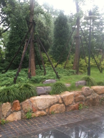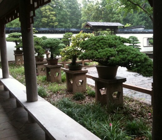 Auf dem Weg zu einem der vier Ausgänge betreten wir noch ein Extra unseres Tickets. Eine durch Weinspaliere untergliederte Außenanlage. In jedem „Raum“ befinden sich Steinpodeste mit den irrwitzigsten Bonsaiexemplaren. Also eine Bonsaisammlung. Wer so etwas schon mal gezogen hat weiß welche Kostbarkeiten wir hier zu sehen bekamen. Niedrigste Schalen mit dicken, gesunden Stämmen in Nadel und Laubsorten. Schön, aber auch unheimlich, wie hier gnadenlos in die Natur eingegriffen wird. Nichts soll so bleiben wie es ist. Bäume werden mit Tuch umwickelt und einem Strick dieses festgezurrt, wahrscheinlich damit am Stamm unten nichts austreibt. Aber es sieht schon gewalttätig aus. Drumherum dann noch Stangen, die mit Draht am Stamm befestigt werden, dann wächst er schön gerade. Der Mensch soll eben sichtbar sein in diesem ganzen Gestutze und Getrimme.