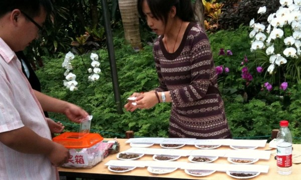 Mit großer Begeisterung wird das Angebot zum Drachenbootfesttag von allen Erwachsenen angenommen. Wir werden angesprochen teilzunehmen. Ich treffe ein Hütchen. Von fünf Würfen! Klaus zwei. Ist gar nicht so einfach. Dann dürfen wir aus einer durchsichtigen Box drei Zettel ziehen. Auf dem ersten steht, dass ich an diesem Drachenfesttag besonders glücklich sein werde. Mit den beiden anderen Zetteln habe ich je ein Samentütchen gewonnen. Ich kann unter drei Sorten wählen. Ich nehme Löwenmäulchen. Daneben noch ein Tisch mit Untertassen auf denen verschiedene getrocknete Kräuter mit chinesischem und lateinischem Bezeichnungsschild aufgebaut sind. In einem kleinen Stofftäschchen mit Reißverschluss sammelt man die Sorten hinein, die für seine Gesundheit wichtig sind, Reißverschluss zu und jetzt immer am Körper tragen. Mein Spielfilmberater findet es riecht stechend, wie aus dem Halsschmuck, den Mia Farrow in Rosemarys Baby immer um den Hals tragen musste. Außer Bekanntem wie Artimisia, Fenchel, Minze ist auch etwas gegen böse Geister dabei, was wir trotz lateinischer Namensbezeichnung nicht identifizieren konnten. Ist bestimmt sehr gut, es auch zu nehmen.