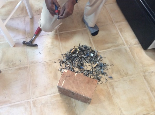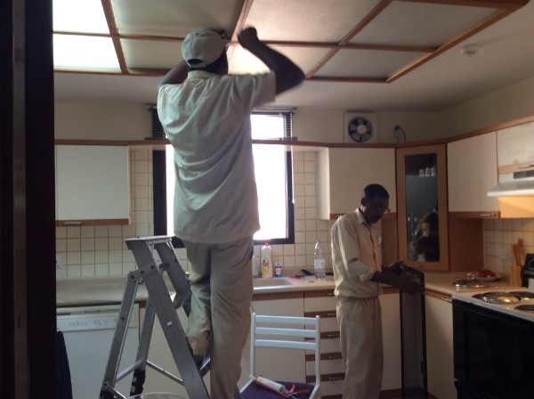 Joysie kommt um 9, die Handwerker auch, diesmal zu zweit und mit Leiter. Als erstes wird ein Schraubenkasten auf dem Boden ausgeschüttet, zum gucken was so alles da ist?? Da bring ich das mit dem Fliegengitter auch nochmal zur Sprache. Also ich laß ihn das Gitter selber verschieben. Und es kippt oben raus. Ein neues Gitter ist noch kleiner. Jetzt schraubt er die Rollen höher. Das hilft. Die Abdeckungen der Röhren werden auch irgendwie mit 100 Schrauben befestigt.