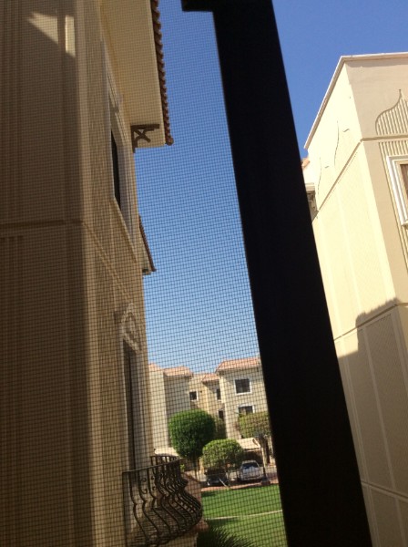 Ich schiebe das Fliegengitter nach links. Es ist zu klein für das Fenster und segelt in den Garten.
