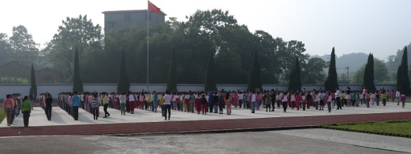 7:00 können die Schüler in die Schule hinein, 7:40 lesen sie an ihren Plätzen bis 8:00. Mit ihren Klassenlehrerinnen gehen sie dann auf den Schulhof zum kollektiven Frühsport. Durch eine Lautsprecheranlage werden mit Musik hinterlegt die Figuren angesagt. Montags danach noch die Hymne und ein Schüler hisst die Flagge dazu. Oder wenn etwas Besonderes los ist. Heute ist Mittwoch und die Flagge wird gehisst.