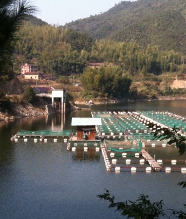 In 300m Entfernung sind Bassins einer Fischfarm zu sehen.