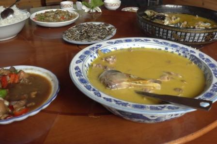 Zum Essen waren wir bei zwei Brüdern und den Eltern. Also dreimal lecker essen. Die Tische waren übersäht mit Schüsseln und Platten.