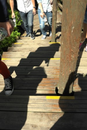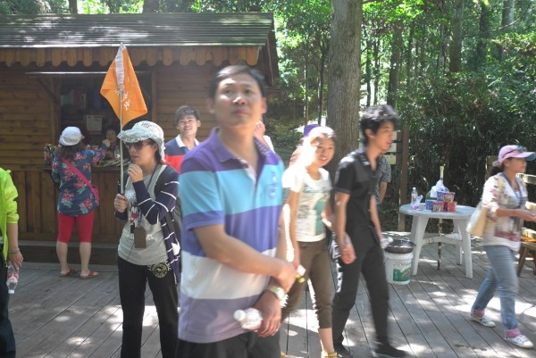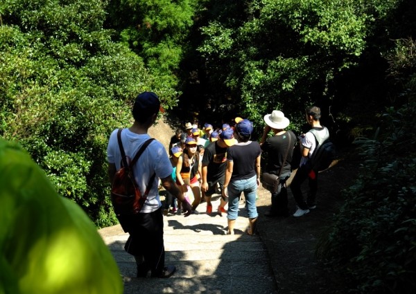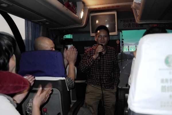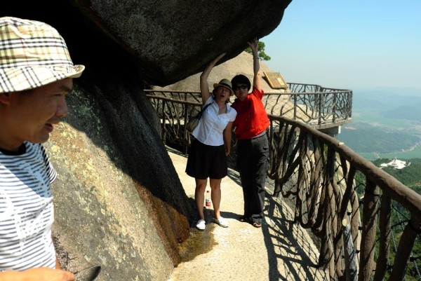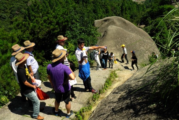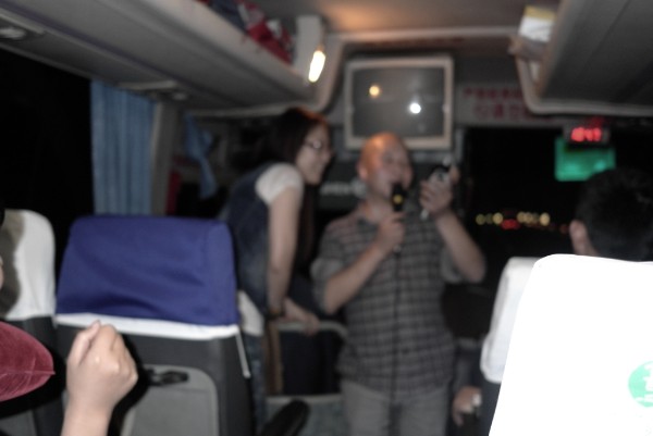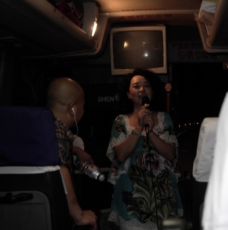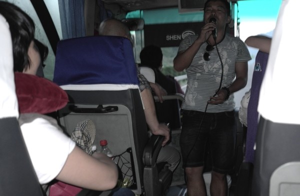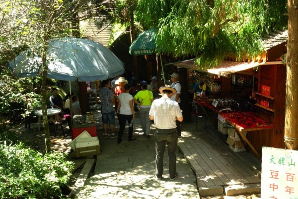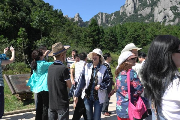 In dem Übernachtungshotel wird kurzer Prozess mit unserer Anmeldung gemacht. Zwei für zwei gebuchte Zimmer schlafen in einem Zimmer und wir übernehmen das andere angemeldete Zimmer. Jetzt brauchen wir überhaupt nichts auszufüllen. Manche Hotels dürfen nämlich keine Ausländer beherbergen. Wir müssen uns ja auch abmelden, um uns woanders anmelden zu können. Von Hotel zu Hotel, von Stadt zu Stadt, von Polizei zu Polizei. Also es wird beschlossen, dass das alles viel zu aufwendig ist. Es gibt in der Gruppe genug von Partei und Government, die das verantworten können. Nehme ich mal an. Nicht der richtige Augenblick mit Fragen zu nerven. Vom Hotel fahren wir mit unserem Bus zu unserem Abendessen Restaurant. Ich möchte Wein dazu ausgeben und bespreche mich vorsichtig mit J. Sie ist begeistert. Ich suche zwei Weiß- und zwei Rotweinflaschen aus. Es wird ein Eimer mit Wasser und Eiswürfeln für den Weißen gebracht. Wir sitzen auf zwei Räume verteilt. Klaus hält eine kleine Rede. Anstoßen in jedem Raum an jedem Tisch, eine Rede auf die schöne Landschaft und unsere soziale Integration in dieser Gruppe. Die Stimmung steigt. Eine Schuldirektorin will uns zum Dinner und in ihre Schule einladen. Ein anderer in seine Möbelfabrik. Einer ist ein Nachbar mit einem Plotter für Fassaden-Prospekte an den wir uns jetzt vom sehen erinnern. Dem Alphaweibchen aus Qushou sind wir beim joggen auf den Berg am Wochenende begegnet. Alle sind der Meinung plötzlich fließend Englisch sprechen zu können und dass diese Sprache eigentlich gar nicht so schwer ist. Jetzt wollen alle noch in eine Karaoke Bar. Wir klinken uns aus. Alle, aber wirklich alle steigen aus dem Bus, wir fahren alleine weiter zum Hotel. War das richtig die Gruppe mal von uns zu befreien? Könnte beides der Fall sein. Was für ein Tag. Heute geht es Punkt 8 zu der Kletterei. Und wieder Absperrungen und Wegführung nur für einzelne gehbar, wie für einen gefährlichen Massenandrang vorbereitet. Ein Teil des Berges wird mit einem Shuttle Bus bewältigt. Und dann geht es endlich mit dem wandern los. Treppen und Wege sind kunsthandwerklich aus Holz gefertigt. In der ganzen Stadt bin ich noch auf keinen so planen, ebenen Flächen gegangen. Höhenunterschiede werden nirgends ausgeglichen, neu verlegte Platten sind zerbrochen, ein Holterdiepolter bei dem man höllisch aufpassen muss. Nicht so hier. Und es geht steil bergauf. In die Holzböden sind auch noch Baumstämme integriert. Neben dem Holzsteg ein Bach, mal ein kleiner Wasserfall. Alles geordnet, gepflegt, kunstvoll angelegt von Menschenhand. Natur at its best. Immer wieder Aussichten auf Steingruppen weiter oben, die die Phantasie anregen. Eine Maus trifft auf eine Schildkröte. Eine Frau und ein Mann. Die größere Figur ist die Frau, weil in dieser Provinz der Frau mehr Respekt gegenüber gebracht wird, als dem Mann. „In all other of China is the other way, you know? “. Und Hauptsache die Kohle stimmt. Dabei sind sich beide Geschlechter zutiefst einig. Eh nicht der Hauptgewinn als Partner in Sicht ist, wird verglichen, weiter gesucht und gejammert. An einer Felsspalte kann nur einzeln durchgegangen werden. Es bildet sich keine Schlange, sondern ein großer Haufen über zwei sehr steile Steintreppen verteilt. Trotzdem schieben und drängeln einzelne hindurch. Wartezeit eine halbe Stunde. Mir fehlt dazu die chinesische Unbefangenheit gefährlichen Situationen gegenüber. Es ist möglich dieses Massending zu umgehen, wird gesagt. Drei Männer unserer Gruppe, die mit dem Schalk im Nacken, schließen sich uns an. Treffen wollen wir auf alle dann an einem der alle 100m gelegenen Rastplätzchen. An die Felsen ist ein Rundumweg aus Beton gebaut. Gigantische Aussichten. Auskragende Felsen zum photographieren. Es tut gut aus dem Rummel herauszukommen. Und der sonnige Herbst genau richtig für diese Tour. Zum Mittag fahren wir die Kantine einer Brillenfabrik an. „International Design“. Nach dem Essen große Sitzung. Wir fragen mal vorsichtig um was es sich dreht. Die Rechnung von gestern Abend, Karaoke und noch mal ein Essen um Mitternacht müssen noch zusammengelegt werden. Der Rückweg liegt vor uns, nachdem wir noch „local products“ in einem Geschäft kaufen konnten. Ich nehme rote getrocknete, längliche Äpfelchen. Jetzt geht es im Bus mit der Stimmung richtig hoch her. Jeder muss was singen! Einer macht den Conferencier. Wir müssen ran. Zu zweit „Freude schöner Götterfunken“ und später Klaus alleine „Im Frühtau zu Berge“. Es wird mitgeklatscht. Als wir in Qushou ankommen werden wir alle zum Dinner von der Frau eingeladen, die dort wohnt. Ich halte eine kleine Rede als Privatperson über die persönliche Atmosphäre der Fahrt an der wir foreigners teilnehmen durften und als citizen von Deutschland werde ich weitergeben, dass China touristisch nicht nur aus Peking, Shanghai und der Terrakotta Armee besteht, sondern wunderschöne Landschaften aufweisen kann. Applaus, mit allen zuprosten, Fotos machen, die Emotionen schwappen hoch. Wir klettern alle noch mal in diesen unglaublich schmutzigen Bus und dösen glücklich vor uns hin, bis er nach einer Stunde vor unserem Hotel ankommt und alle, die ihren Benz, Audi, Porsche am Hotel geparkt hatten steigen mit uns aus. Auf dem Weg zum Fahrstuhl schmieden wir Energie geladen Pläne für Einladungen, die wir immer schon mal aussprechen wollten.