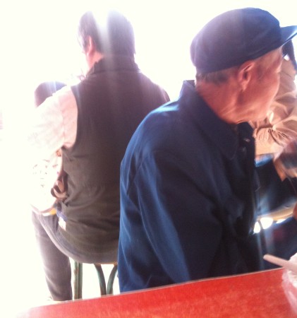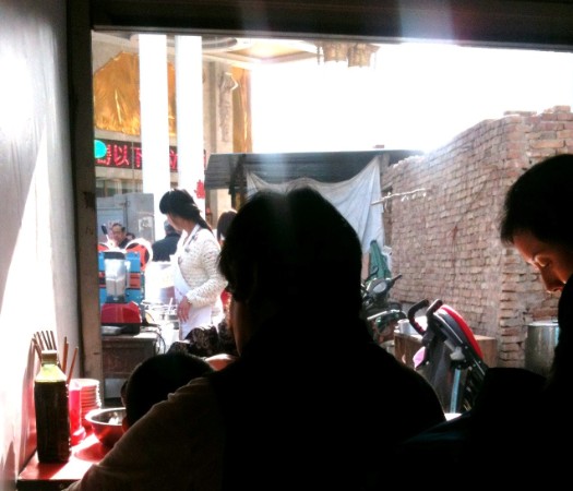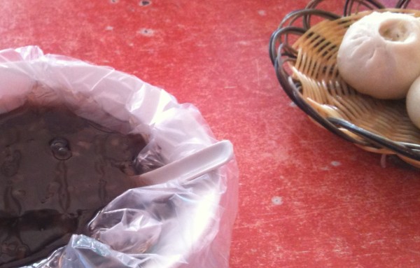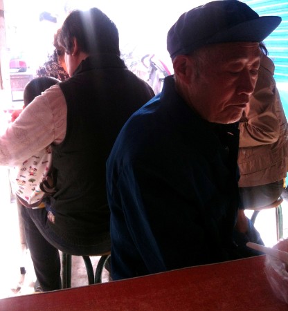 Schön fängt mein Tag zum Frühstück auf dem Markt gegenüber unserer Anlage an. Aus 6 verschiedenen Getreide-Suppen nehme ich eine dunkle und 2 gefüllte Hefebälle. Mir gegenüber sitzt ein alter Mann in Maojacke und Mütze, der streng guckt. Ich versuche ein ganz kleines Andeutungs-Versuchslächeln. Sein ganzes Gesicht strahlt und leuchtet auf.