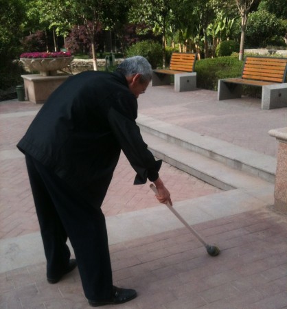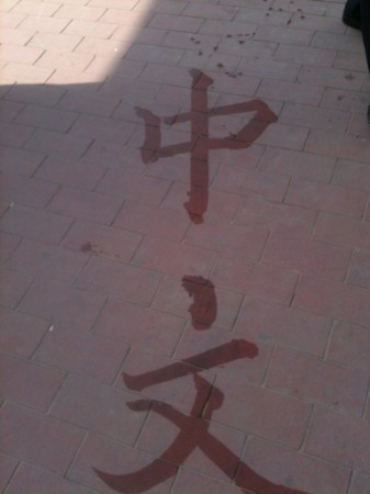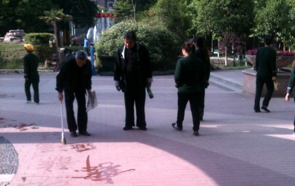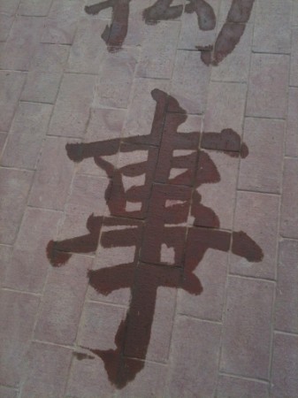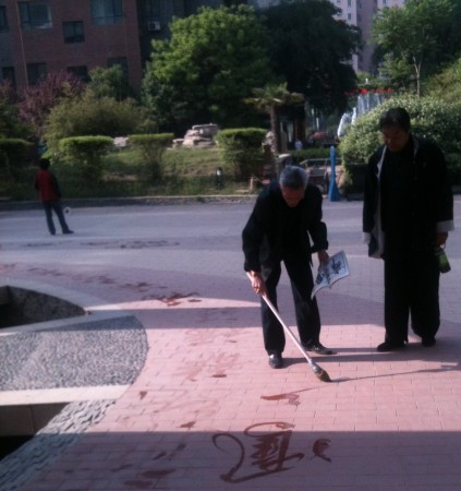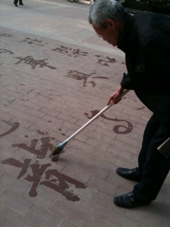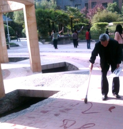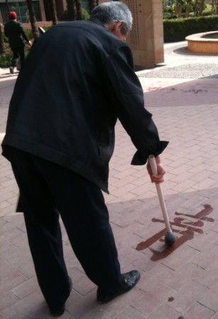Jeden Morgen malt er mit Wasser Gedichte auf die Steinplatten. Jedes Zeichen soll besonders gut werden. Sie trocknen schneller weg als er fertig wird. Er malt mit größter Freude, Entspanntheit und Konzentration. Und erzählt mir alles über die Gedichte. Sie handeln von der großen, runden Welt. Und der Zeit. Der endlosen Zeit.