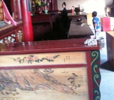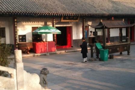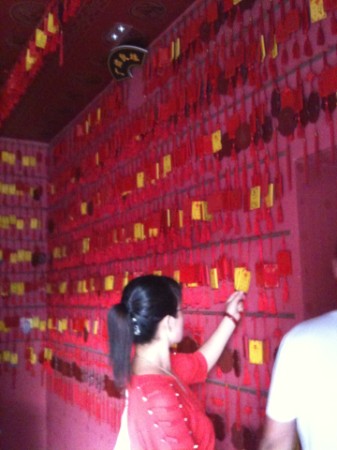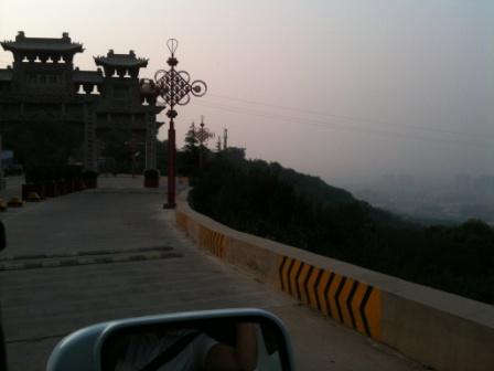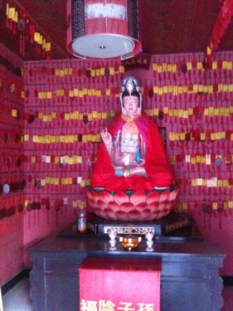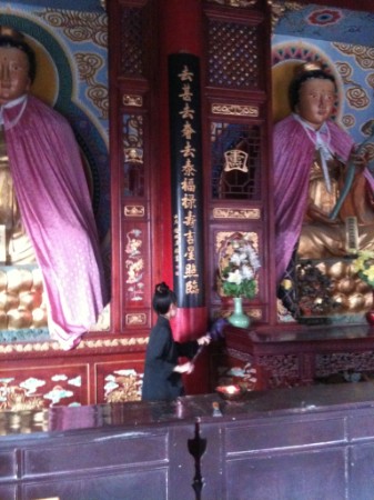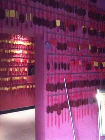 Die Bergauffahrt führt mit einer Serpentinenstraße zu einem Kloster. Lao Mudian. Ein taoistischer Tempel. Nonnen in weißen Kniestrümpfen über den langen blauen Hosen und Dutt auf dem Oberkopf. Mehrere Gebäude, Tempel, viel Gold und Räucherei, Götterfiguren. Ein Raum bespickt mit roten Ketten, Anhängern, Täschchen. Wände und Decke, voll gesteckt. Wünsche, Geschenke von Besuchern.