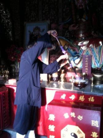 Man kann lange Räucherkerzen kaufen. Nach einer Weile werden sie von vor dem Hauptaltar eingesteckten Kerzen, nach draußen in einen größeren Behälter umgesteckt. Dann gibt es Platz für die Kerzen der nächsten Besucher.